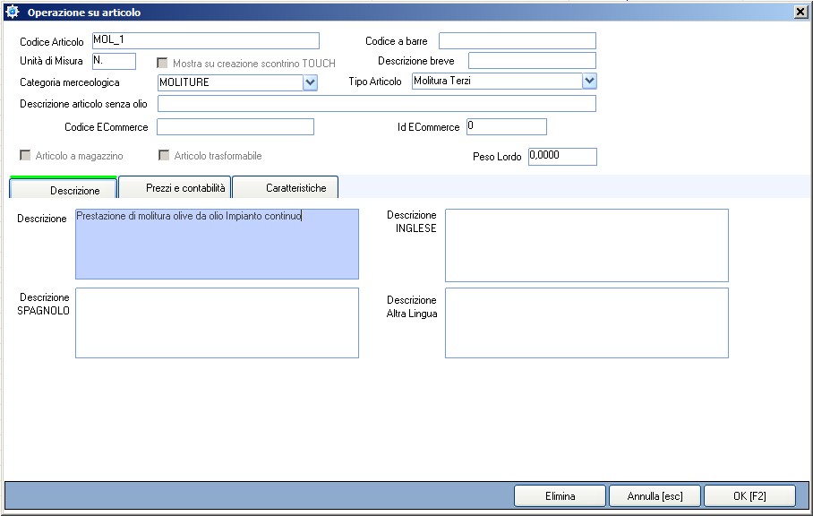 La descrizione è molto importante in quanto è proprio il testo che apparirà in automatico nella fattura di molitura.