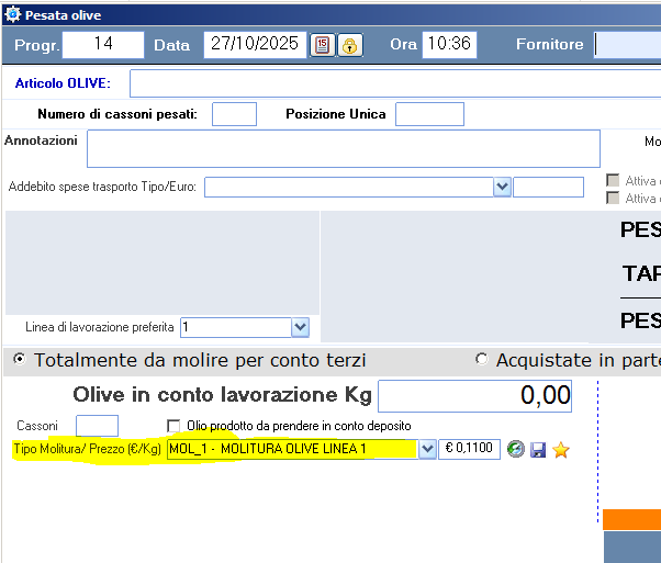 A questo punto sarà possibile, nell’operazione di generazione di un nuovo carico di olive, scegliere il tipo di molitura da utilizzare scegliendo, appunto tra i vari articoli di tipo “Molitura terzi” precedentemente registrati, applicando il prezzo indicato nell’anagrafica dell’articolo corrispondente.