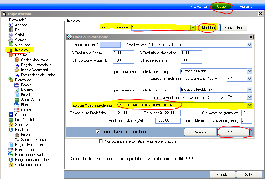 Dalle opzioni di Extravirgin, in alto a destra, cliccare su “OPZIONI”, scegliere “IMPIANTO”, selezionare la linea di lavorazione per la quale si desidera impostare il tipo di molitura predefinita, cliccare “MODIFICA” e nella finestra che appare, selezionare la “Tipologia di molitura predefinita” tra gli articoli di tipo “Molitura Terzi” registrati. Salvando si applica la registrazione desiderata.
