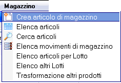 Per registrare un nuovo articolo molitura dunque è possibile agire dal menù principale di Extravirgin, cliccando su “Magazzino” e scegliendo la voce “Crea articolo di magazzino”, come in figura: